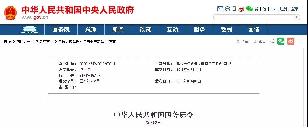 國務(wù)院總理李克強(qiáng)簽署國務(wù)院令,公布《政府投資條例》,自2019年7月1日起施行。