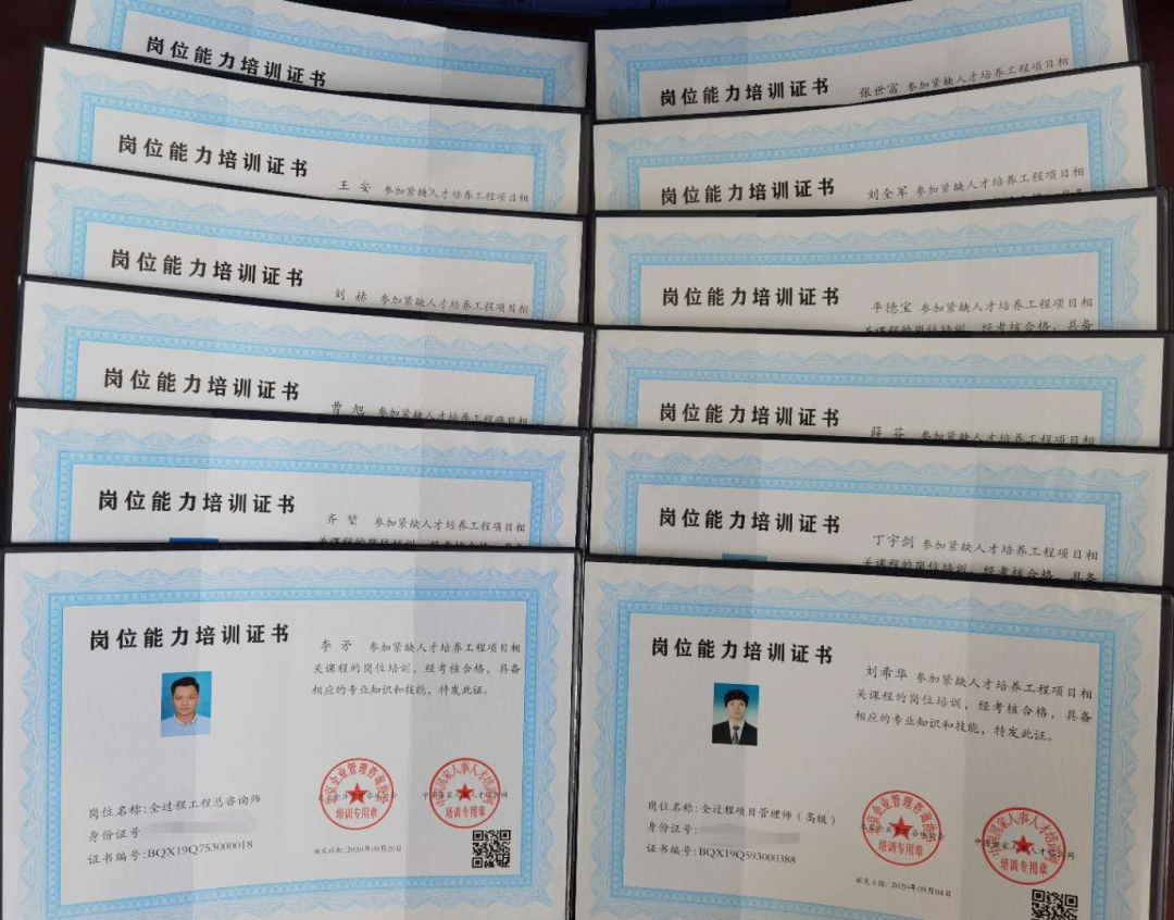 為適應工程咨詢服務行業(yè)的發(fā)展變革,同時進一步促進公司提升發(fā)展,鑫科公司著力推進職工崗位技能培訓。2020年7月公司動員并組織廣大干部職工參加全過程工程咨詢的專業(yè)學習,共計14名干部職工參與了培訓,培訓內(nèi)容涉及建設項目全過程工程咨詢及操作、建設項目全過程工程咨詢操作實務、全過程咨詢項目團隊組建以及全過程工程咨詢招投標法律風險防范等。參訓全體人員于7月31日參加并通過了相關資格考試,9月取得了中國國際工程咨詢協(xié)會頒發(fā)的崗位能力資格證書。其中4人取得全過程工程總咨詢師證書,7人取得全過程工程項目管理師證書,3人取得全過程專業(yè)咨詢工程師證書。公司領導班子均取得了相關證書。9月繼續(xù)參加了中國國家人事人才培訓網(wǎng)的崗位能力提升培訓,并獲得了崗位能力培訓證書。